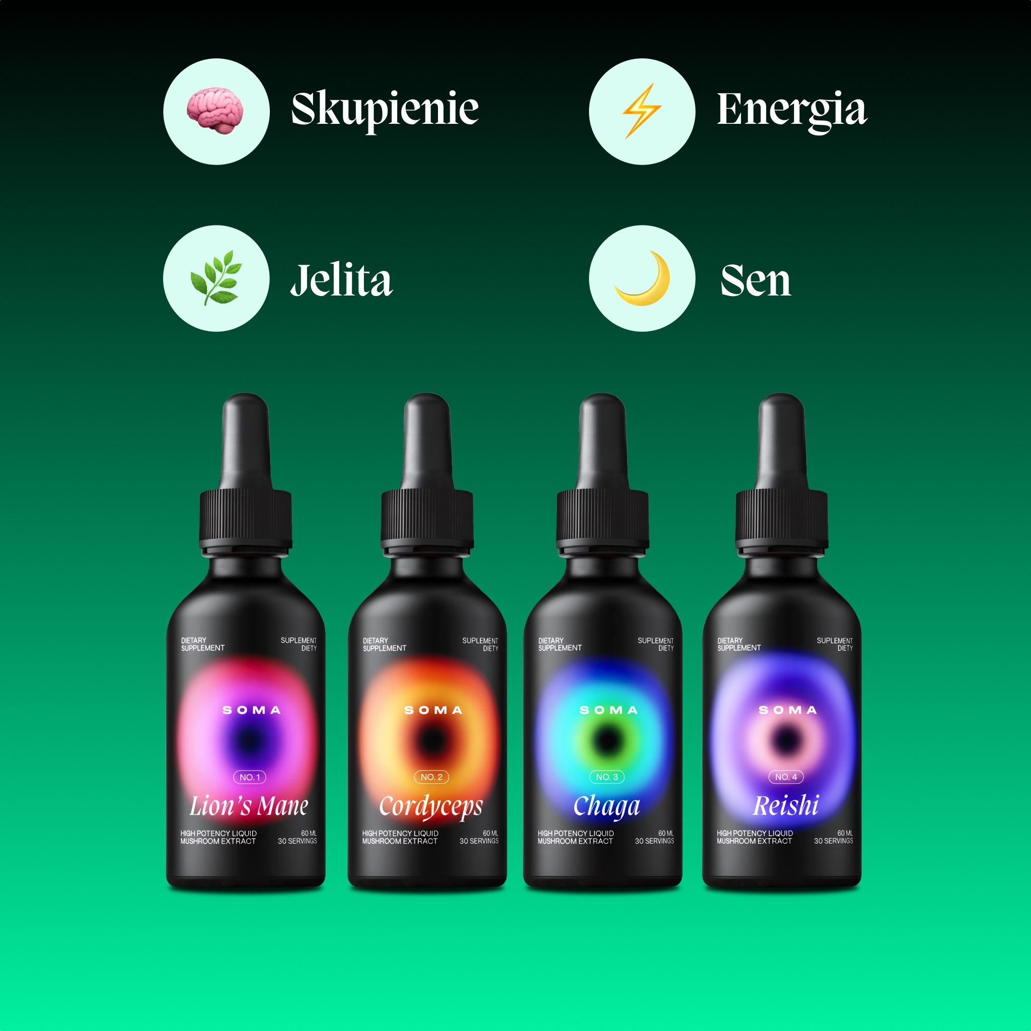 Bo SOMA to adaptogeny nowej generacji – w pełni aktywne ekstrakty z owocników grzybów, w dawkach, które naprawdę działają. Otrzymujesz czysty skład, przyjemną formę karmelowych kropli i efekty, które realnie poczujesz. To inwestycja w jasność umysłu, odporność i codzienną gotowość do działania.